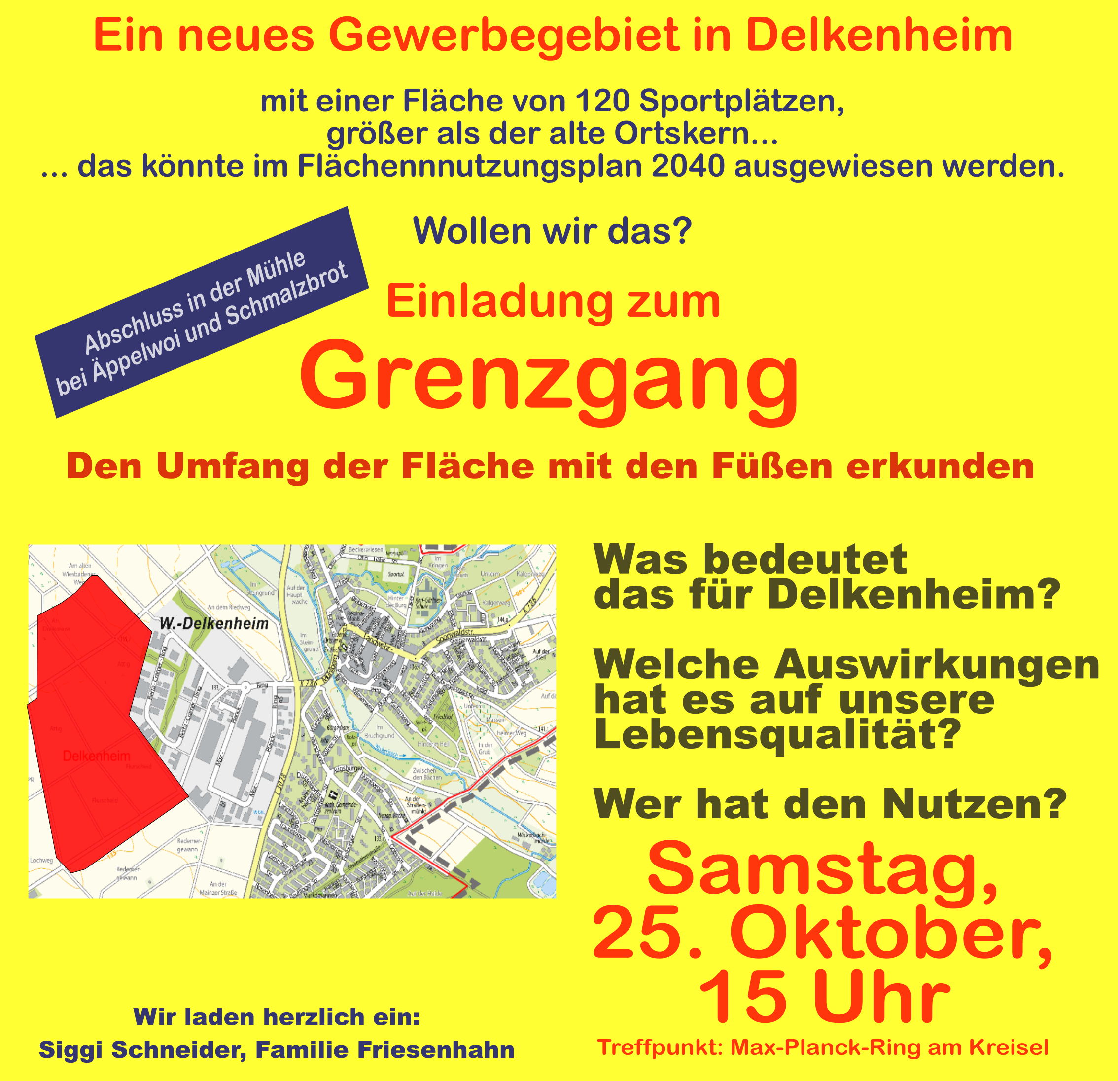 Um sich ein Bild von der Dimension des Vorhabens zu machen, laden die Familien Siggi Schneider und Andreas Friesenhahn am Samstag, 25. Oktober, zu einem Grenzgang ein. Bei dieser Begehung können Interessierte die betroffene Fläche erkunden und sich über die offenen Fragen austauschen.