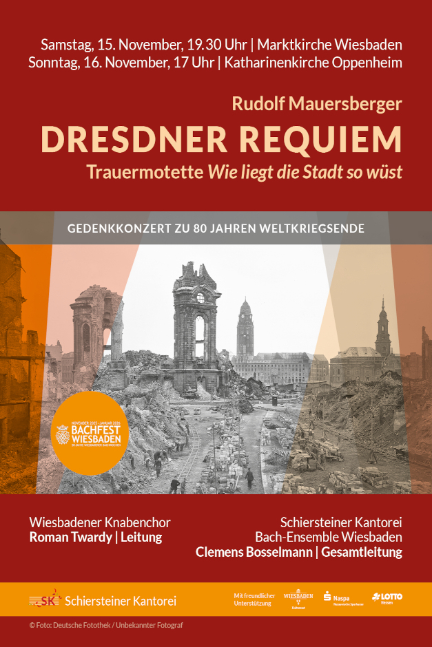 Am Samstag, 15. November, lädt die Schiersteiner Kantorei zu einem musikalischen Ereignis von besonderer historischer und emotionaler Tiefe ein. Anlässlich des 80. Jahrestages des Endes des 2. Weltkriegs steht Rudolf Mauersbergers zutiefst bewegendes Werk, das "Dresdner Requiem“ sowie die Trauermotette "Wie liegt die Stadt so wüst", auf dem Programm in der Marktkirche Wiesbaden.