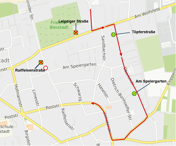 Die Haltestellen „Leipziger Straße“ und „Raiffeisenstraße“ können während der Maßnahme nicht bedient werden. Stattdessen werden die Haltestellen entlang der Umleitungsstrecke angefahren.