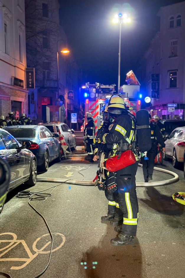 Bereits vor Eintreffen des Löschzuges hatten Polizeikräfte vom nahe gelegene n1. Revier Geistesgegenwart bewiesen und mit der Räumung des Objekts begonnen. Die Feuerwehr setzte umgehend mehrere Trupps unter Atemschutz ein. Die Lage im Vorderhaus war besonders kritisch. Eine Person musste von den Brandschützern mittels einer Fluchthaube durch das völlig verrauchte Treppenhaus ins Freie gerettet werden. Um sicherzustellen, dass sich niemand mehr in den Wohnungen befand, mussten die Einsatzkräfte mehrere Türen gewaltsam öffnen.