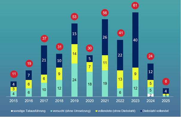 Ein spektakulärer Erfolg gelang bei der Bekämpfung von Geldautomatensprengungen. Gab es im Rekordjahr 2023 noch 61 Fälle, schrumpfte die Zahl im Jahr 2025 auf lediglich sechs Fälle zusammen. Die „Allianz Geldautomaten“ aus Banken, Politik und Polizei hat Hessen für Kriminelle unattraktiv gemacht – durch Vernebelungstechnik, Einfärbesysteme und Nachtverschlüsse machen Täter nun einen „weiten Bogen um Hessen“.