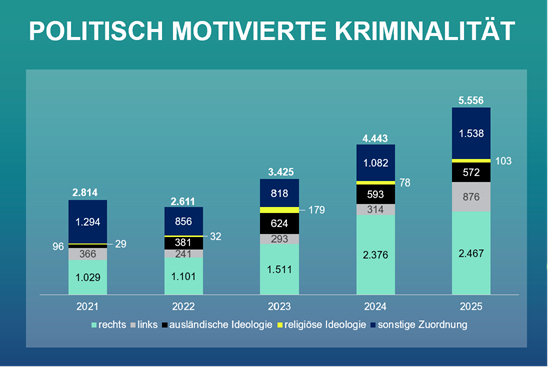 Auch die politisch motivierte Kriminalität nahm um 25,1 % zu. Während der Rechtsextremismus mit einem neuen Höchststand von 2.467 Taten weiterhin die größte Gefahr darstellt, verzeichnete der Linksextremismus einen sprunghaften Anstieg um knapp 180 %. Zudem verdoppelten sich die Angriffe auf Amts- und Mandatsträger (994 Fälle).