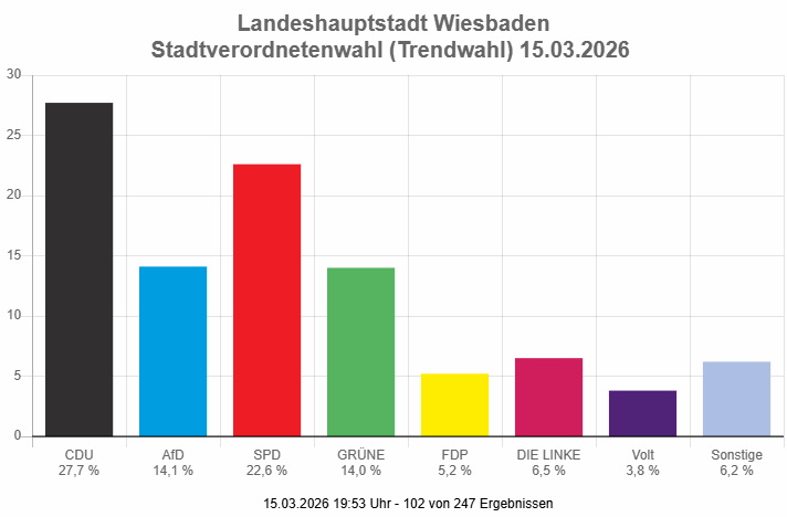 19:55 Uhr 102 von 247 Ergebnissen liegen vor. Die CDU liegt mit 27,7 % weiterhin vornbe, gefolgt von SPD 22,6 % – AfD 14,1 % und Grüne 14,0 % belegen Platz 3 und 4. In drei Ortsteilen Rambach, Auringen und Medenbach liegen alle Trendergebnisse (Listenkreuze) bereits vor.