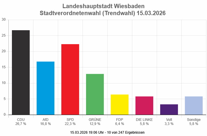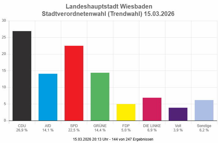 20:15 Uhr 144 von 247 Ergebnissen liegen vor. Die CDU liegt mit 26,9 % weiter vorne, gefolgt von SPD 22,5 %, Grüne 14,4 % und AfD 14,0 %