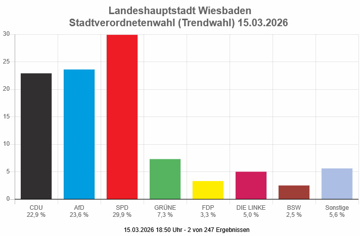 19:03 Uhr: 2 von 247 Ergebnissen liegen seit 18:50 Uhr vor. Die SPD liegt in den ersten beiden Bezirken vorne. Es wurden nur die Listenkreuze ausgezählt.