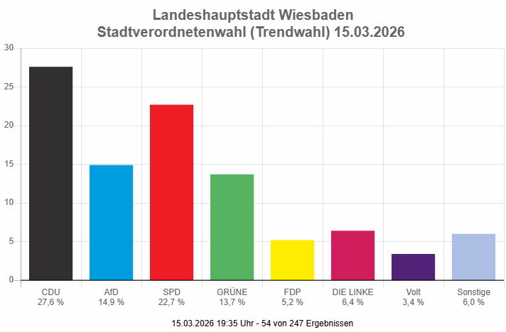 19:37 Uhr 54 von 247 Ergebnissen liegen vor. Die CDU liegt mit 27,6 % vorne, gefolgt von SPD 22,7 %, AfD 14,9 % und Grüne 13,7 %