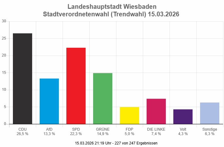 20:15 Uhr 144 von 247 Ergebnissen liegen vor. Die CDU liegt mit 26,9 % weiter vorne, gefolgt von SPD 22,5 %, Grüne 14,4 % und AfD 14,0 %