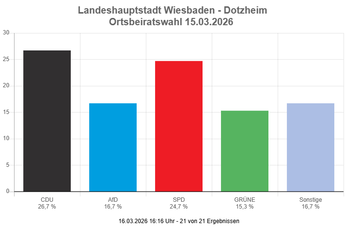 Überraschend stark präsentiert sich die AfD, die mit 16,7 % der Stimmen als drittstärkste Kraft in den Ortsbeirat einzieht. Sie liegt damit gleichauf mit der Summe aller „Sonstigen“ Gruppierungen. Die Grünen müssen sich in Dotzheim mit 15,3 % der Stimmen begnügen.