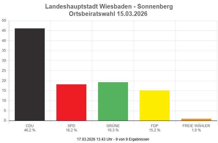 Im Wiesbadener Stadtteil Sonnenberg herrscht seit Dienstagnachmittag, 17. März Gewissheit. Alle neun Wahlbezirke sind ausgezählt und liefern ein eindeutiges Bild. Mit einer Wahlbeteiligung von 63,1 % unterstreichen die Sonnenberger ihr hohes politisches Interesse – fast zwei Drittel der 6.002 Wahlberechtigten gaben ihre Stimme ab.