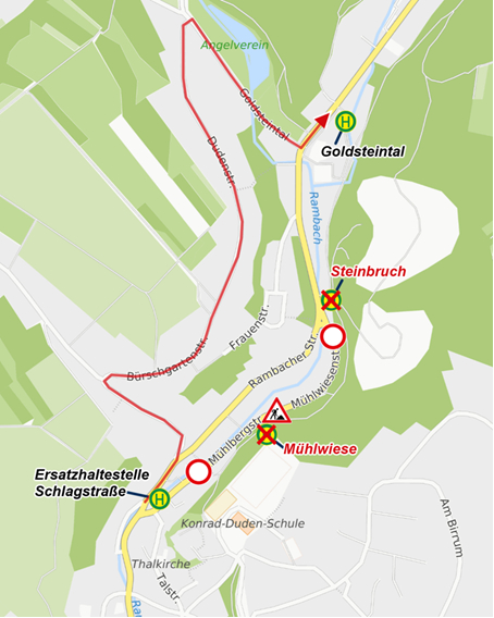 In Richtung Rambach gilt der normale Fahrtweg bis zur Haltestelle „Hofgartenplatz“. Anschließend erfolgt die Umleitung über die Schlagstraße zur Ersatzhaltestelle „Schlagstraße“, weiter über Hirtenstraße, Bürschgartenstraße, Dudenstraße, Goldsteintal und Ostpreußenstraße zur Haltestelle „Goldsteintal“. Danach wird der normale Fahrtweg wieder aufgenommen. Die Haltestellen „Mühlwiese” und „Steinbruch” entfallen im genannten Zeitraum ersatzlos.