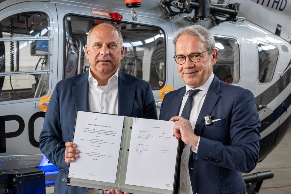 Hessens Innenminister Roman Poseck (CDU) und Thüringens Innenminister Georg Maier (SPD) haben bei der Polizeifliegerstaffel in Egelsbach eine Vereinbarung zur gemeinsamen Beschaffung neuer Polizeihubschrauber unterzeichnet.