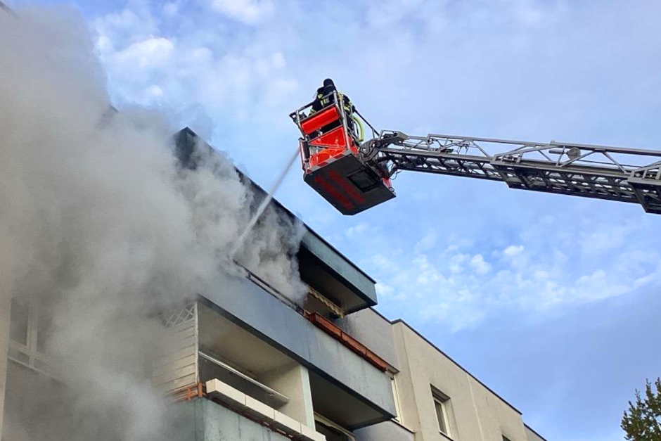 Unter hohem Zeitdruck brachten die Brandschützer die Drehleiter in Stellung, während Atemschutztrupps in das verrauchte Treppenhaus eilten. Durch das schnelle Eingreifen konnte zwar ein Übergreifen des Feuers auf die gesamte Wohnung verhindert werden, doch die Schäden durch Ruß und giftigen Qualm sind immens.