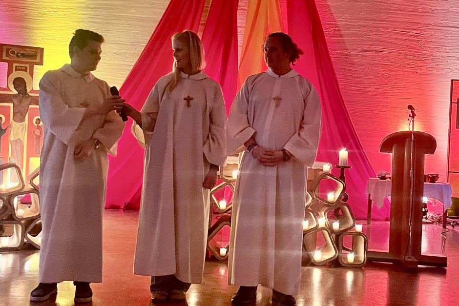 Erst in der Woche nach Ostern war eine 15-köpfige Jugendgruppe aus der Pfarrei St. Birgid selbst nach Frankreich gereist. Diese intensiven Erfahrungen brachten die Jugendlichen nun aktiv in die Gestaltung des Erbenheimer Gottesdienstes ein. Sie berichteten von Bibeleinführungen, Workshops und den Zeiten der Stille, die sie gemeinsam mit 2.000 anderen jungen Menschen in Burgund erlebt hatten.